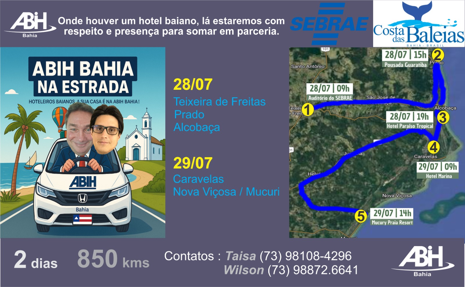 Nesta segunda edição, o presidente estadual da ABIH Bahia, Wilson Spagnol, se une ao presidente da Regional Extremo Sul, Vinícius Oliveira, para visitar hotéis e reunir-se com empresários locais nas cidades de Teixeira de Freitas, Prado, Alcobaça, Caravelas, Nova Viçosa e Mucuri. A comitiva percorre mais de 850 quilômetros em dois dias, com o lema: “Onde houver um hotel baiano, lá estaremos com respeito e presença para somar em parceria.”